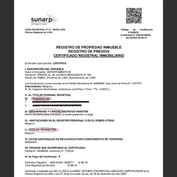 Es el documento más importante para conocer la situación legal de un inmueble en SUNARP. Aquí puedes verificar: Quién es el propietario legal y si existen hipotecas, embargos u otras cargas que pueden impedir o condicionar la venta.
